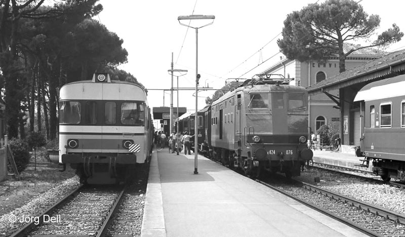 Während die E.428 auf Gleis 1 auf ihre Rückfahrt wartet, kreuzen ein Aln.668 der FSF und E.424.076 (OM/1949). Was hier noch nicht richtig zu erkennen ist, ist …