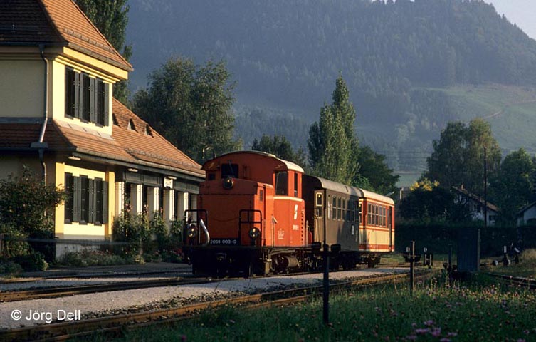 Am nächsten Tag stand die damals noch schmalspurige Strecke Gresten-Ober Grafendorf auf dem Programm. Der abendliche Zug nach Ober Grafendorf war mit der 2091.003 bespannt (Foto in Gresten).