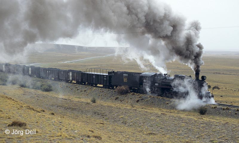 Bei strömendem Regen führt die Nr. 105 einen beladenen Kohlezug nach Rio Gallegos.