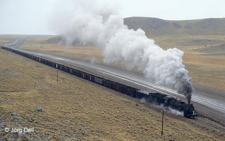 Teilweise verläuft die Bahn direkt neben der Straße Nr. 40, neben der Panamericana die zweite große Fernverkehrsstraße Patagoniens. Bei einer Autodichte von 1-5 pro Stunde reicht eine Schotterpiste wohl aus. Nr. 108 zieht ihren Leerzug bei Bella Vista nach Rio Turbio.