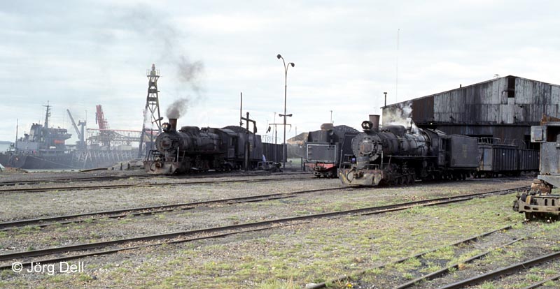 Blick ins Depot mit den Loks 105, 104 und 113. Gerade wird ein Kohlefrachter beladen.