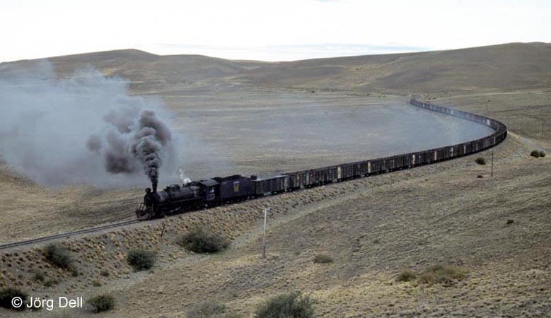 Hier ist der Zug bei Las Buitreras zu sehen. Normalerweise brauchen die Züge ca. 9 Stunden für die 255 km lange Strecke. Dieser aber ist extrem langsam geworden und schon jetzt Stunden im Verzug. Die Lok scheint den Geist aufzugeben. Für uns nicht nur das letzte Foto vor dem Sonnenuntergang, sondern – weil Freitag - mutmaßlich auch unser letztes Streckenfoto dieser Bahn überhaupt. Wir fahren mit dem Auto weiter und quartieren uns kurz vor Rio Turbio ein.