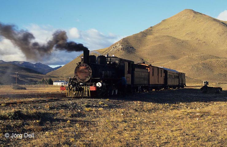 Nr. 16 (Baldwin 55444/1922) legt am 31.3.96 auf dem Weg von Esquel nach El Maiten einen Halt in Nahuel Pan ein.