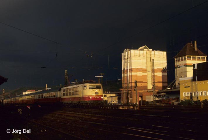 Ein heftiges Gewitter zieht am 6.4.87 auf, während 103 221 im letzten Sonnenlicht durch Gelnhausen eilt