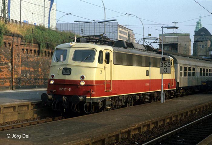 112 311 mit einem Eilzug in Hamburg Hbf am 7.8.1982.