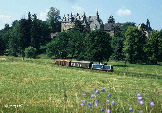 Auch diese Trasse ist längst einem Radweg gewichen: Die Vogelsbergbahn Stockheim - Lauterbach (Hessen), die zum Zeitpunkt der Aufnahme (13.7.1987) noch zwischen Oberwald und Lauterbach im Gv betrieben wurde. 211 299 vor dem Schloss Eisenbach.