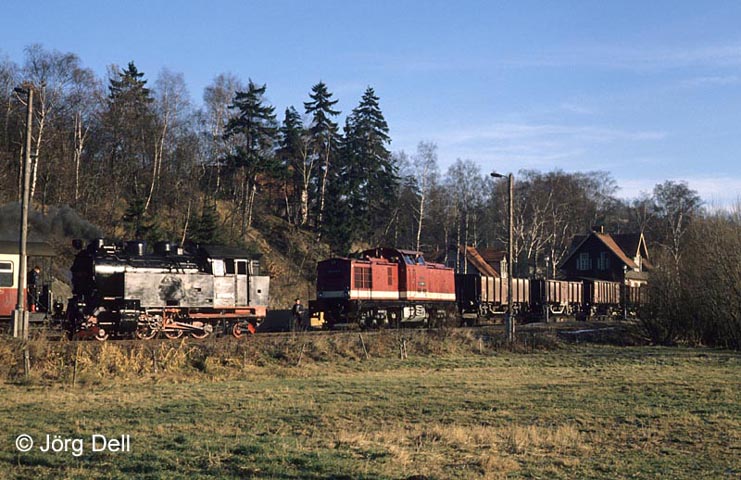 Leider war ich einen Hauch zu spät im Harz, denn die Gz-Leistungen wurden bereits durch die Harzkamele erbracht. Das Foto entstand am 3.12.89 in Straßberg, als 99 6001 einen Gz mit 199 871 kreuzt.