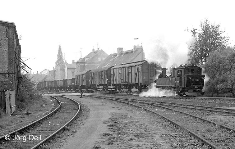 Nun zu den Resten der Döllnitzbahn Oschatz-Mügeln-Kemmlitz. 99 1582 fährt in Oschatz ein, 22.4.90.