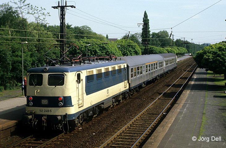 Am 26.5.87 hatte ich das Glück, dass die Lok des Karlsruher Zuges, die 141 248, für den Pendel nach Duisburg-Entenfang zuständig war. Hier verlässt sie den Wedauer Bahnhof.