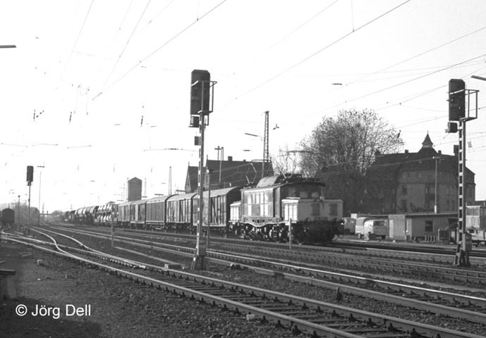 Leider etwas ungünstig von den Lichtverhältnissen her lag die Fahrzeit des sonntäglichen Dg53752 Mannheim-Bebra. Am späten Nachmittag durchfuhr er das Kinzigtal und hatte die Sonne ziemlich genau im Rücken. Hier passiert der farbliche Sonderling 194 178 den Bahnhof Gelnhausen am 12.2.84.