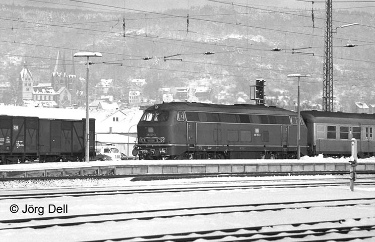 Am 8.1.85 wartet die Limburger 216 131 mit N6932 (Gelnhausen-Gießen-Limburg) auf Abfahrt - ein fast immer lohnenswerter Zug, hatte Limburg doch noch überwiegend rote 216er im Bestand.