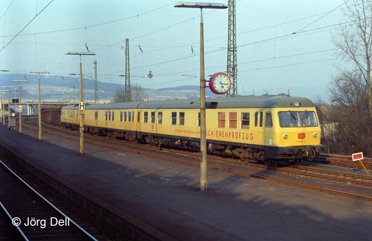 Im Bahnhof Wächtersbach ruht sich der Schienenprüfzug 719 501/720 001/719 001 aus (3/1982).