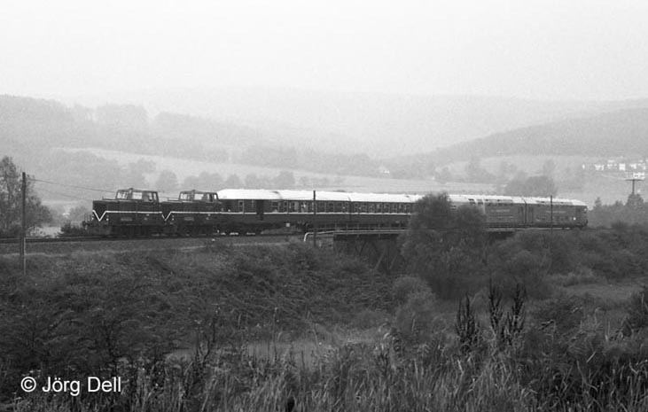 Als am 13.8.86 die Lübecker Verkehrsfreunde mit ihrer LBE-Doppelstockeinheit zu Gast auf der Orber Kleinbahn waren, musste eine zweite Lok unterstützen. Gemeinsam ziehen VL 11 und 12 (MaK 220037/1959) die an den Planzug angehängte Wagengarnitur über die Kinzigbrücke. Die Orber Bahn hatte noch eine dritte Lok gleichen Typs (VL 13), aber nur die eine Personenwagen-Garnitur.