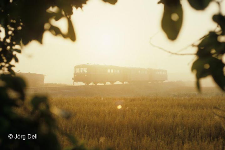 Frühmorgens kam bereits eine Schienenbusgarnitur nach Gelnhausen, die dann bei Sonnenaufgang als Leerzug mit Ziel Büdingen durch Lieblos fuhr (hier am 13.8.84).