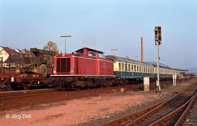 Hier sehen wir am 15.3.84 die Giessener 211 174 vor einer stilreinen LS-Wagengarnitur mit N6944 im Bahnhof Lieblos. Damals wurden noch alle drei Bahnhofsgleise genutzt, heute ist nur noch eines geblieben.