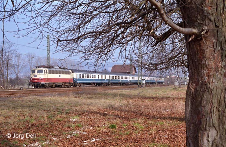 Die Hamburger 112 311 war mein Favorit unter den 112ern, da sie durch die in Teilen noch vorhandene Regenrinne, silbergraues Dach, Griffstange und Metall-DB-Schilder noch am „ursprünglichsten“ aussah (Bf. Hailer-Meerholz, 14.3.84).