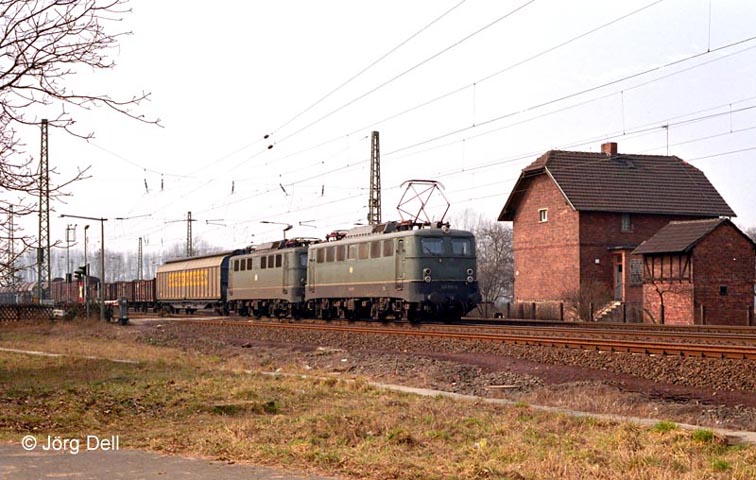 Zwei grüne 140er mit Regenrinne, angeführt von 140 510, am 15.3.84 an der östlichen Bahnhofsausfahrt Hailer-Meerholz.