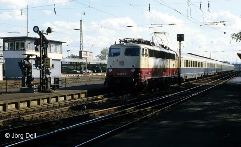 112 488 am 9.10.85 mit einem D-Zug, dem zwei Bpmz291 zur Überführung beigestellt waren.