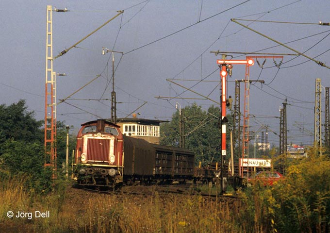 212 124 verläßt Hanau am 8.9.88 mit einem Güterzug.