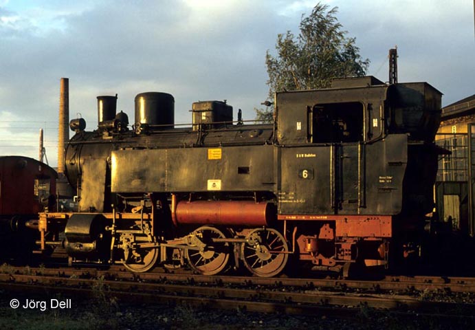 Am 19.9.90 gerade frisch im Bw Hanau eingetroffen präsentiert sich die Nr. 6 des Hydrierwerks Rodleben (LHB3129/1929). Die Lok ging an die Dampfbahnfreunde Kahlgrundbahn, die sie neu lackierten und als „89 906“ beschrifteten.