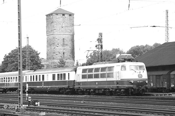 103 207 mit einem IC, dem ein Salonwagen der Bauart WGSüg801 beigestellt war (7.7.86).