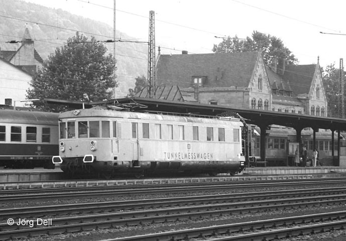 Der Tunnelmesswagen 712 001 auf dem Weg zum Burghauner Tunnel am 7.7.86.