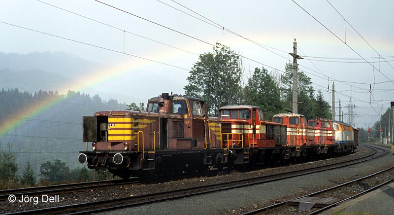 Bilder 12-13: 1996 wurde sie zusammen mit KBE V23, KBE V53, KBE V54 und KFBE V57 von Lengerich nach Udine (Italien) überführt. Bild 12 zeigt die Fuhre am 13.9.96 in Loifarn auf den Tauern.