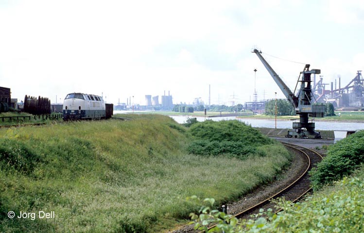 221 103 erreicht gleich den Bahnhof Hochfeld-Süd. Das Gleis rechts unten führt zum Südhafen (8.6.85).