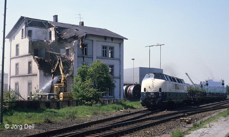 Als 221 123 am 25.5.87 nach Hochfeld-Süd einfährt, ist dieses markante Verwaltungsgebäude im Abriss begriffen.