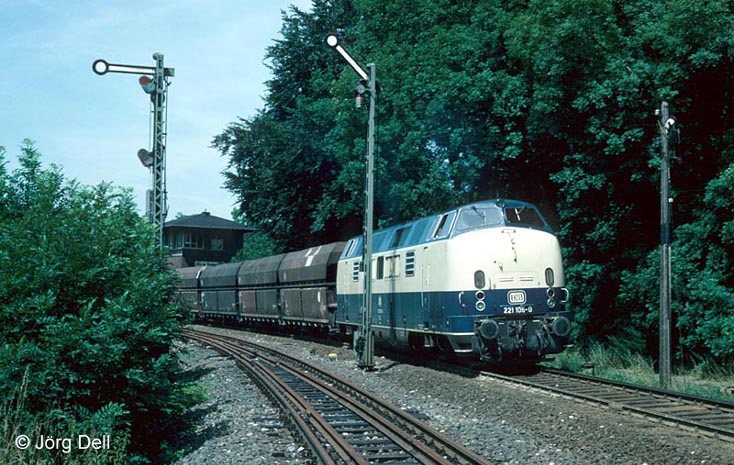 Leider war die Strecke ganz und gar nicht TMT-freundlich gelegen. Bei meinem ersten Besuch stieg ich in Ratingen-Ost aus der S-Bahn und begab mich zu Fuß zum Abzweig Anger, was angesichts der hochsommerlichen Hitze eine schweißtreibende Angelegenheit war. Und der Mühe bescheidener Lohn: EIN einziger mit V200 bespannter Zug, eine 216 und dann stundenlang nichts mehr. Hier also meine Tagesausbeute vom 21.7.83.
