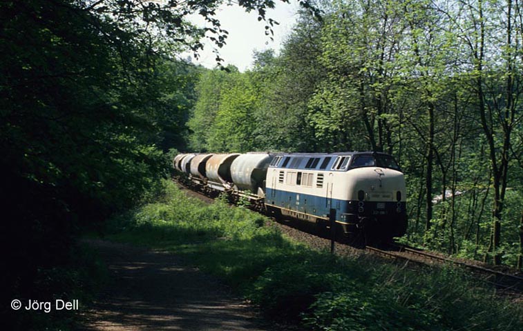 Etwas mehr Glück hatte ich dann am 25.5.87, wenngleich auch nur in beige/türkiser Form. Bei Steinkothen kommt mir 221 138 entgegen. Dank des diesmal mitgebrachten Drahtesels konnte ich nun tiefer ins Tal hervordringen.