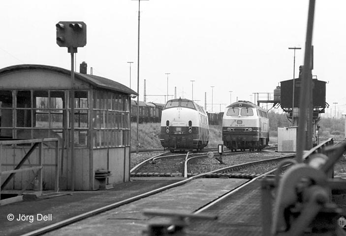 221 116 und 216 026 im Bw Gelsenkirchen-Bismarck, 21.6.87.