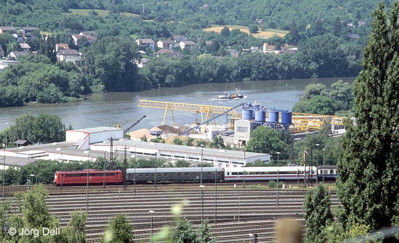 Ein ICE-Mittelwagen wird am 30.7.96 von einer 151 durch Würzburg-Zell überführt.