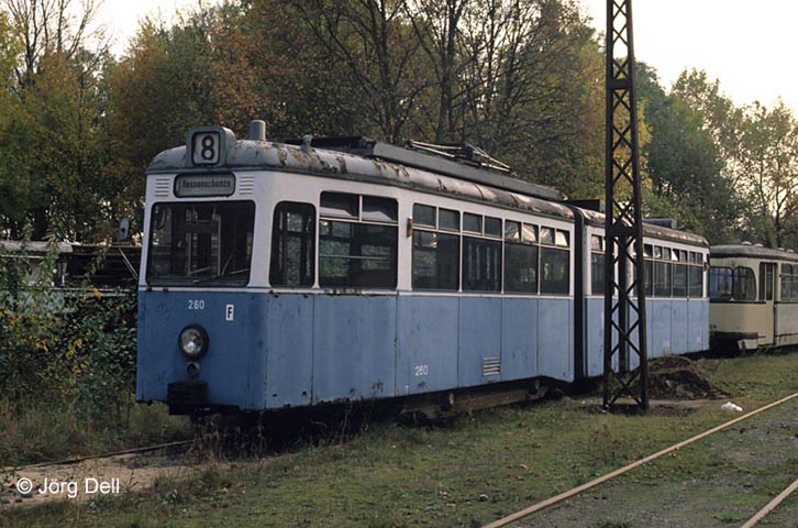 Beginnen wir mit dem Urahn der Kasseler Sänftenwagen, dem 260 vom Verbandstyp, den Crede 1955 für Kassel beschaffte. Am 28.10.89 fand ich ihn im DSM Wehmingen vor.