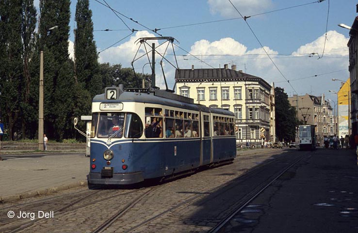 Kurz darauf wurden mehrere (ich glaube zehn) Wagen nach Gorzów in Polen verkauft. Hier fuhren sie noch lange in ihrer Kasseler Lackierung. Nr. 204 (ex 268) am 27.8.91.