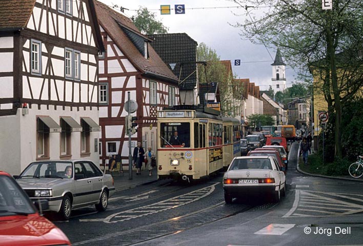 Als echte Straßenbahn musste sich die Linie 1 in Eberstadt gegen den stinkenden Verkehr behaupten. Hier Tw 15 mit Bw 202 am 10.5.89.