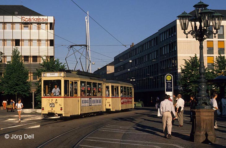 Tw 14 + Bw 196 fahren am 23.5.89 in den Luisenplatz ein.