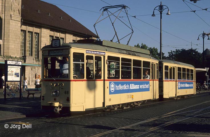Der ex-Regensburger Tw 88 wartet mit werbemäßig passendem Bw 200 am Hbf. auf Abfahrt (24.5.89).