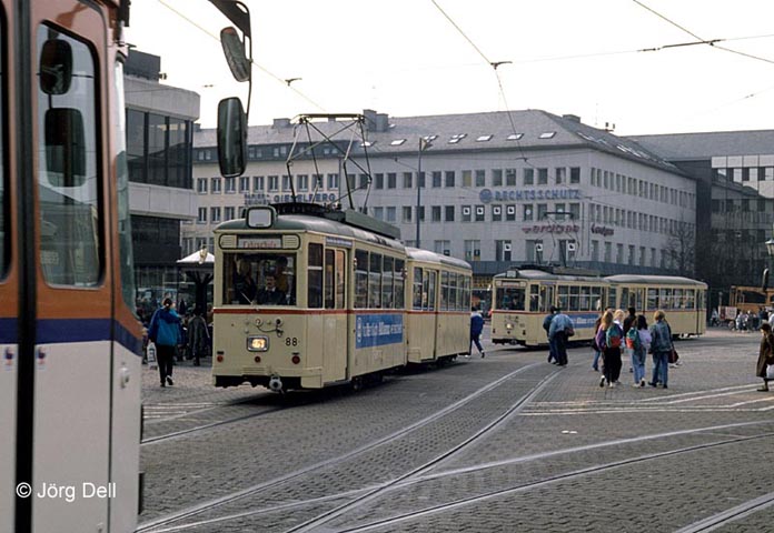 Gleich beide verbliebenen Regensburger Tw kehren am 22.1.90 in Fahrschuldiensten aus Griesheim zurück: Tw 88 + Bw 201 sowie Tw 86 + Bw 198 auf dem Luisenplatz.