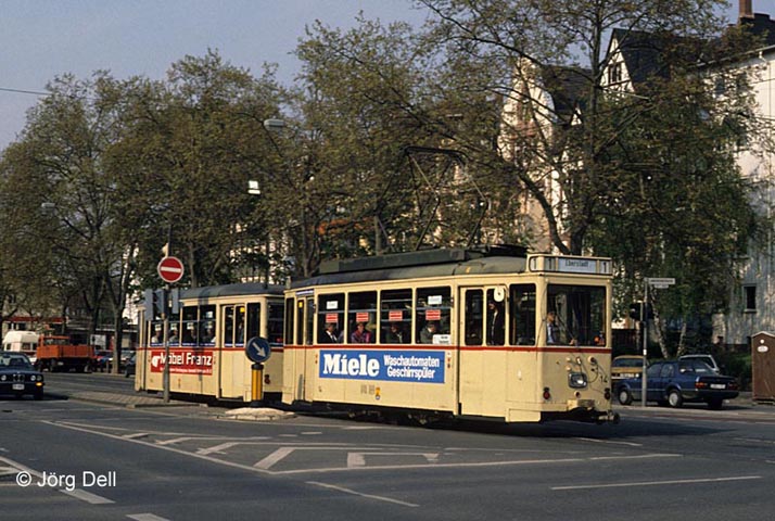 Tw 14 und Bw 196 sind hier auf der Heidelberger Straße, nahe der Hst. Landskronstraße, unterwegs (24.4.90).