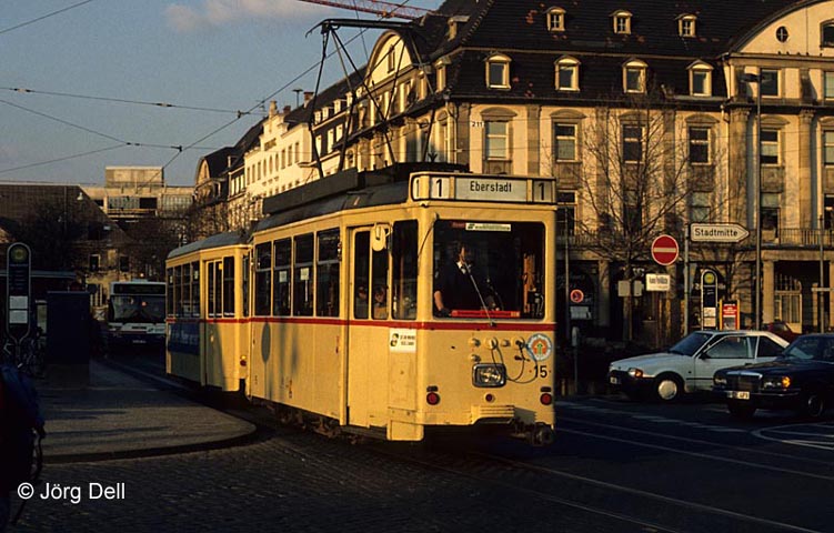 Tw 15 + Bw 202 wieder mal auf der „1“, Hbf., 5.2.91.