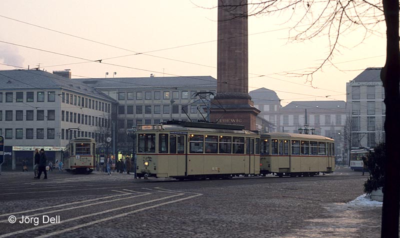 Ein paar Minuten später legt Tw 12 mit Bw 182 einen Halt auf dem Luisenplatz ein. Der Zug der Linie 6 links führt ebenfalls einen zweiachsigen Beiwagen mit (185).