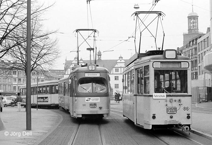Begegnung an der Hst. Schloss mit Tw 96 + Bw 177. Der Beiwagen wurde aus Bielefeld übernommen, wo er einst aus einem Triebwagen entstanden war.