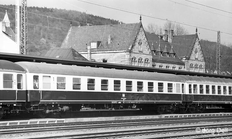 Drei Schätzchen planmäßig in einem Zug: Während ihrer Stationierung in Frankfurt gab es eine Weile, in der die beiden einzigen Exemplare der Gattung Byl423 (Umbauten aus BRyl446) gemeinsam mit einem Aylb401 (und weiteren Wagen) in einer Wagengarnitur eingereiht waren, die im Nahverkehrsdienst zwischen Frankfurt und Fulda pendelte. Das Foto zeigt den Aylb401 10-11 010, während der Zug am 13.04.1983 einen Halt in Gelnhausen einlegt. Auf dem Foto ist schon zu erkennen, dass er von den beiden Raritäten geradezu eingerahmt wurde.