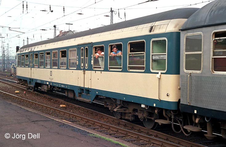 Nicht nur die eigens hergestellten Probewagen trugen die Lackierung des Karlsruher Zuges, sondern auch einige normale Serienwagen. Hier Bnrb725 22-34 400 am 08.07.1983 in Osnabrück.