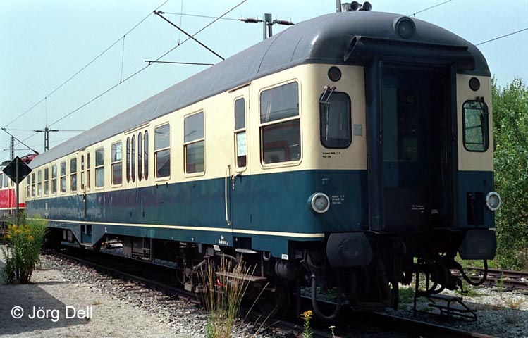 Der zur AEG 182 001 gehörige Steuerwagen, BDylf457 82-11 063, steht am 27.07.1983 im AW München Freimann.