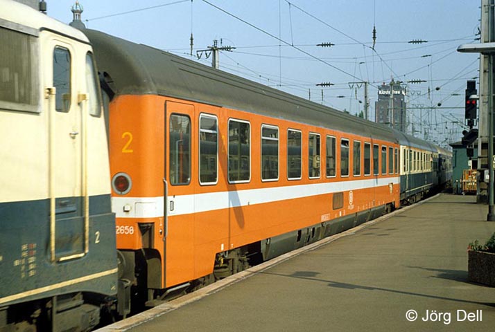 Nun einige eher unspektakuläre Wagen. Die Garnitur des Wien-Oostende-Express war jedoch so herrlich, dass es einfach schön anzuschauen ist: Mit einem SNCB-Eurofimawagen an der Spitze fährt der Zug am 13.07.1982 in Köln ein.